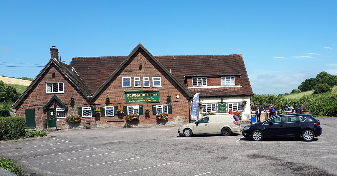 across the fields dancing in the warm sunshine before reaching an awaiting very small crowd of red-shirts and a few drinkers at the Newmarket Inn where the glorious sunshine was full out again with just a memory of passing clouds in the distance.........the rest had speedily finished their walk and had already gone, our suspicions were correct, they must have only seen rain and fog today but we ended in wall to wall blue sky! Oh we love England!