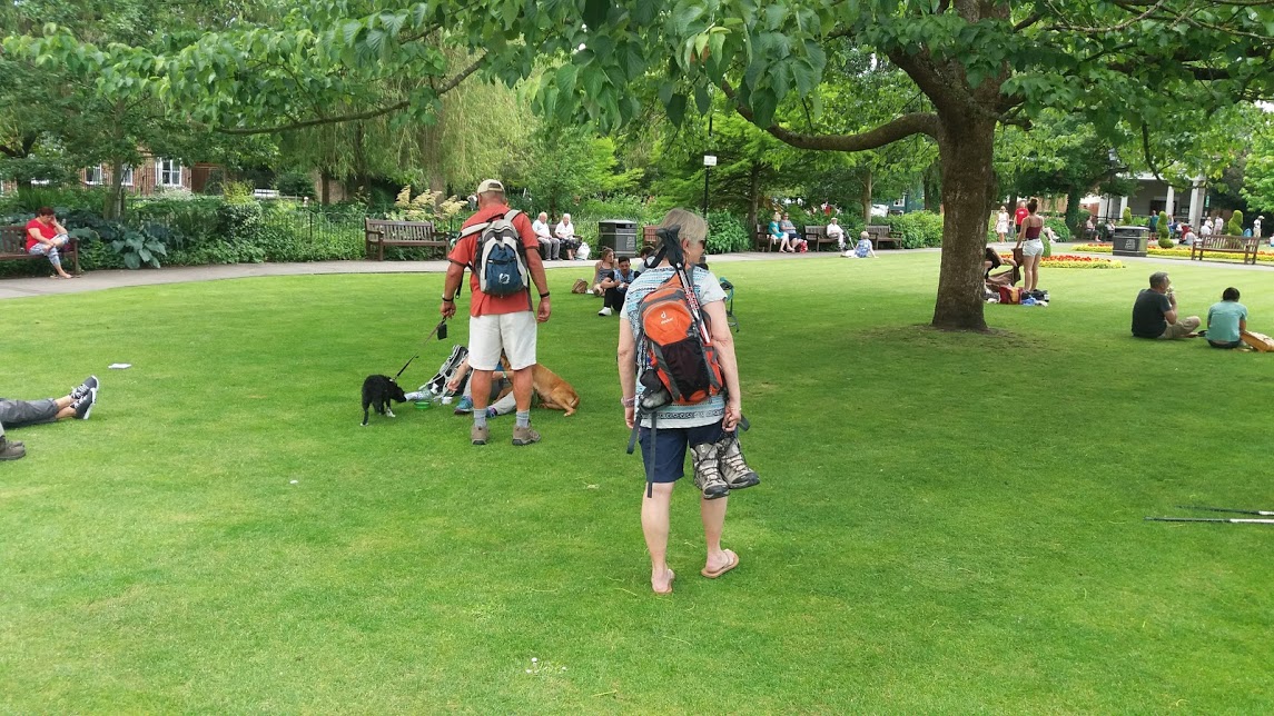 The last day and a long day. We were well prepared and we think we are now getting fitter! However, today the weather is going to do its best to sap our strength as according to BBC app, it's beginning to build up for an impending heat-wave but just the upper twenties predicted for today. Its quite early Saturday morning so the car park is empty, with the exception of our Shoreham group, complete with a full quota of dogs today, some having been rested during the week with sore-paws etc. With the organised reception after the walk it will be many hours before we are back here again.