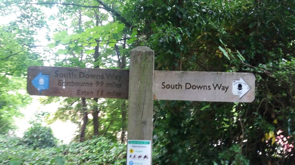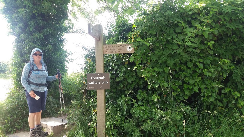 The first view of.......Winchester, looking tantalisingly close with just the M3 to cross and we were there.......... It turned out that this was not as easy as it looked and after photos, a little group now had bunched ready to take the final descent. Walkers were now huddled under the shade of a hedge, re-hydrating and gathering strength before the last 4 miles......yes 4 more miles. The heat was definitely draining and after passing through the pretty 'commuter' village of Chilcombe the SDW split for cyclists and walkers.