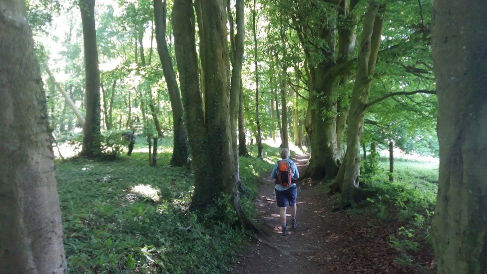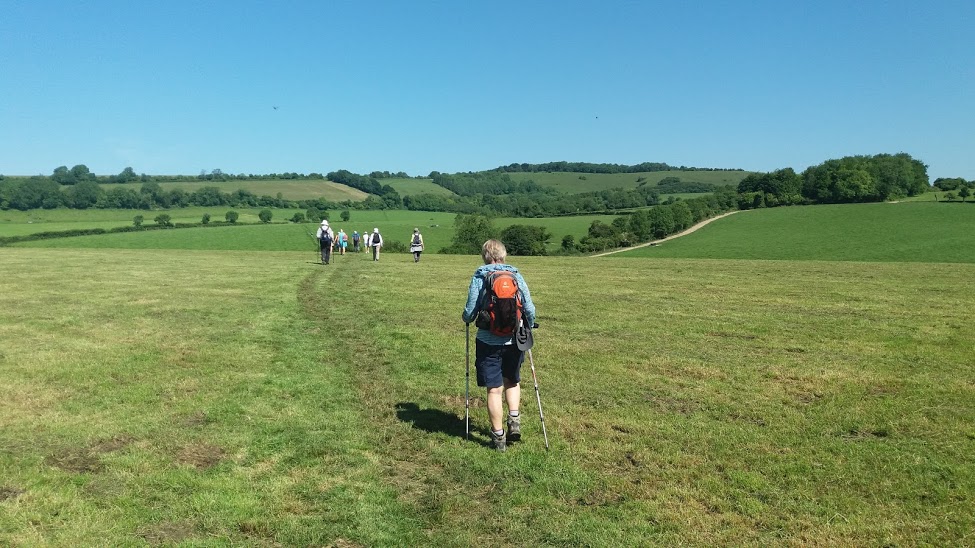 Anyway, back to the walk, the farm track turned back to a path as we headed through the rolling landscape of Gander Down along the Allan King Way, which I assumed was named after Allan and 'Googling' later it was indeed named after a founder member of the local Ramblers, naming the path from Dorchester to Winchester. It was a question of searching for shade now and a spinney on the left came up that was a perfect lunch and loo stop. We joined a couple who had already made it their stop and soon about ten others scattered themselves around in this rarely found shade. There were still about six miles to go and the reception was due to start at 4.30pm so needs must and we carried on down to Keepers Cottage, turning left and along Temple valley where a 'bike-point' was installed in the trees. This consisted of fresh water and somewhere to clean, pump up tyres and give the bike a general overhaul, including yourself, I assume. Should put these in for walkers! We peaked at Cheesefoot Head before crossing the main A272 for the second time today.
