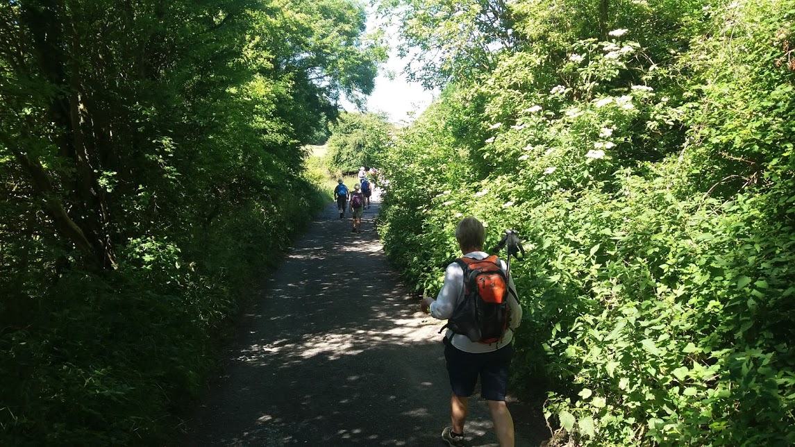 Just a mile to go, said the lady in my pocket that had kept a very accurate account via satellites. Crossing fields and preparing for a steep climb up an uneven track to cross the busy A29 before '9 miles' was announced and arrow-signs told us to leave here choosing a rather overgrown footpath as opposed nice track. It was here we discovered later, that Clive and small dog Lizzie didn't believe the overgrown path to be correct and added another mile on top of the other mile to their journey by becoming 'temporarily uncertain of where they were' (lost)! Back to our path.........a mile long, overgrown and nettles that eventually came out to the car-park at Whiteways Lodge where coaches awaited.