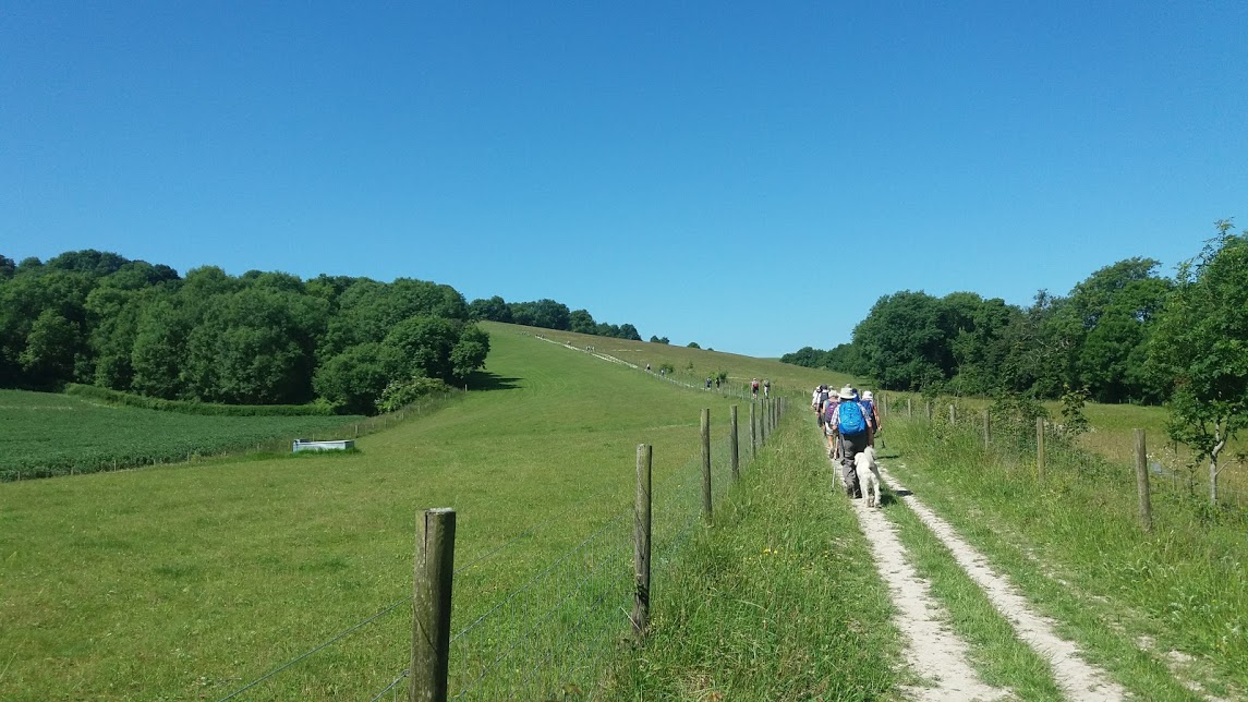 Plenty did as the tables were full in the early sunshine that would stay with us now for the rest of the day. Leaving the pub with a happy stomach we took the 'safe' route through the village, over the duelled A24 and up through a lovely ascent to join, what must be the 'unsafe' route I sumise, at the top of Sullington Hill. With the knowledge this was to be a shorter day today , only 9 miles we were promised, put a spring in our step with thoughts of the cafe near the end for afternoon tea.