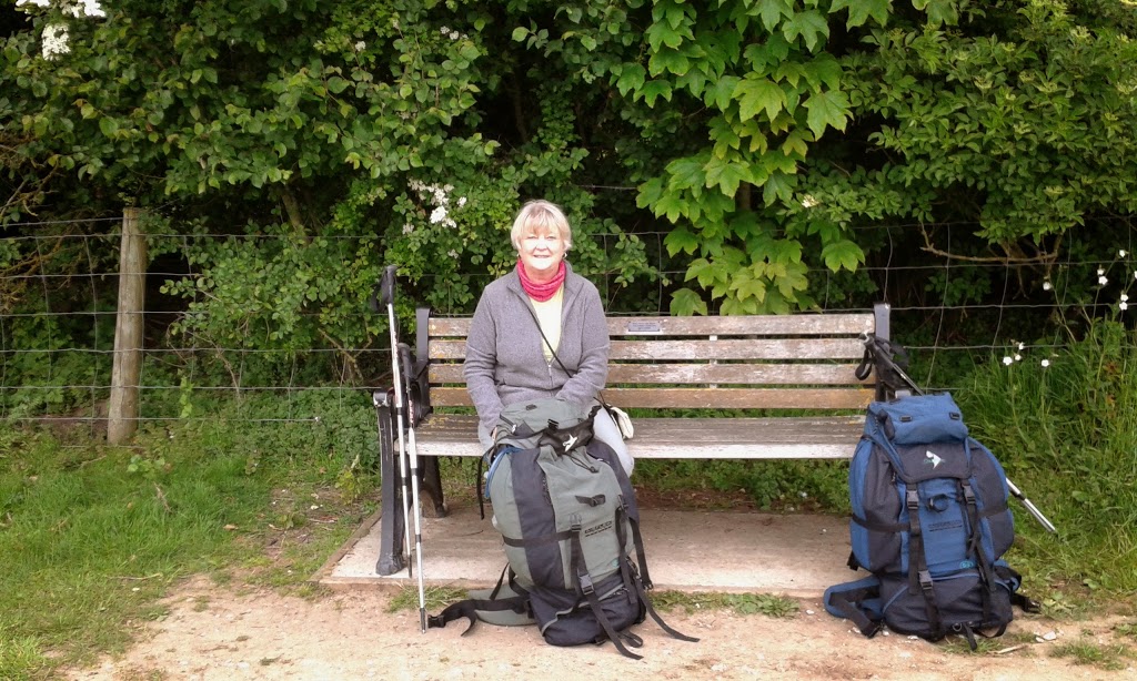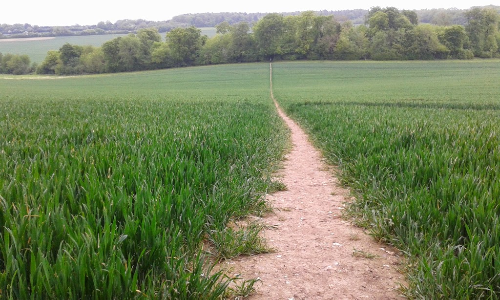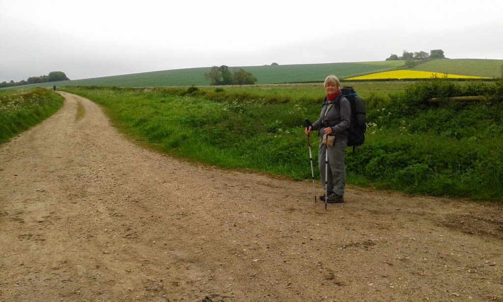 Anyway-the bus was on time, there was no dreadful accident en-route and we happily set off again from where we left off yesterday. The walk today started with a nice downhill section on seemingly much lesser walked paths through woods then undulating across cereal fields with the familar to walkers, single track created initially by the farmer and then mainly by other walkers. Passing through a valley grazed by contented looking sheep and on to