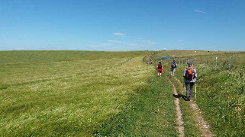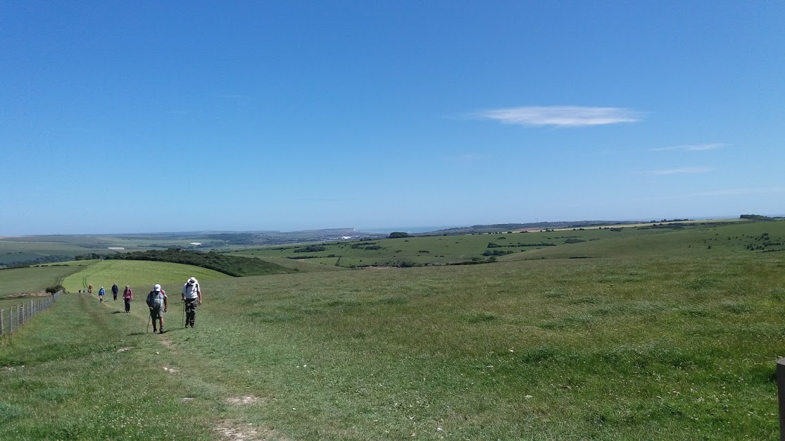 A thoroughly enjoyable first day was over and following a sound-sleep it was back to the carpark to check-in and wait for the shiny Worthing Coach. We recognised the crowd now, Eastbourne man, sisters with large dog, fast couple that appeared to sprint when the coach arrived at our start, young slim-girl who would be joined by her boyfriend from Scotland, later in the week, lady that lived in a house boat.........and so it goes on! I wonder what we were called 'static dwellers' or maybe something worse. It's a shorter journey this time to Alfriston and as it was a Saturday, not much traffic. The coach park in Alfriston was already full with our expectant walkers and also a welcoming committee for the lunchtime stop of the annual Macmillan charity Marathon Walk that we had learned was taking place today.....Brighton to Eastbourne via the Southdowns Way, 1800+ walkers expected! It was never going to be a lonely journey with a snaking trail of green tee-shirted walkers we passed by from before Firle Beacon all the way to Southease station. A good cause and a generally pleasant group, sometimes taking up the whole of the path, some with loud music to pass the time of day and even an accompanying bagpipe player! Of course there was to be some inappropriate shoes (flip-flops) and several dawdlers or late-starters that stood little chance of making Eastbourne before nightfall! After all, It is 26 miles which is a good distance by anyones standards and not to be underestimated especially with the uneven ground, frequent hill sections and the added drain of strong sunshine that was to accompanied us all now for the rest of the day.