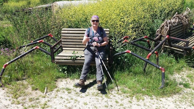 Crossing the railway line at Southease station followed by the bridge over the Ouse and into the pretty village of Southease. Many had adopted the village green as their lunch stop, missing, we felt, the treat of a fresh cup of tea and wee, seeking out the limited shade. The unusually round steepled church was walled and many had rested beneath it, filling drinks dispensers, using the one of several water taps en-route, located just outside the lytch-gate. Out of the village and following a farm track up the valley towards the strangely named, Cricketing Bottom with its arty spider-seats that you really must try-out, before turning upwards through munching cattle and back onto the downs.