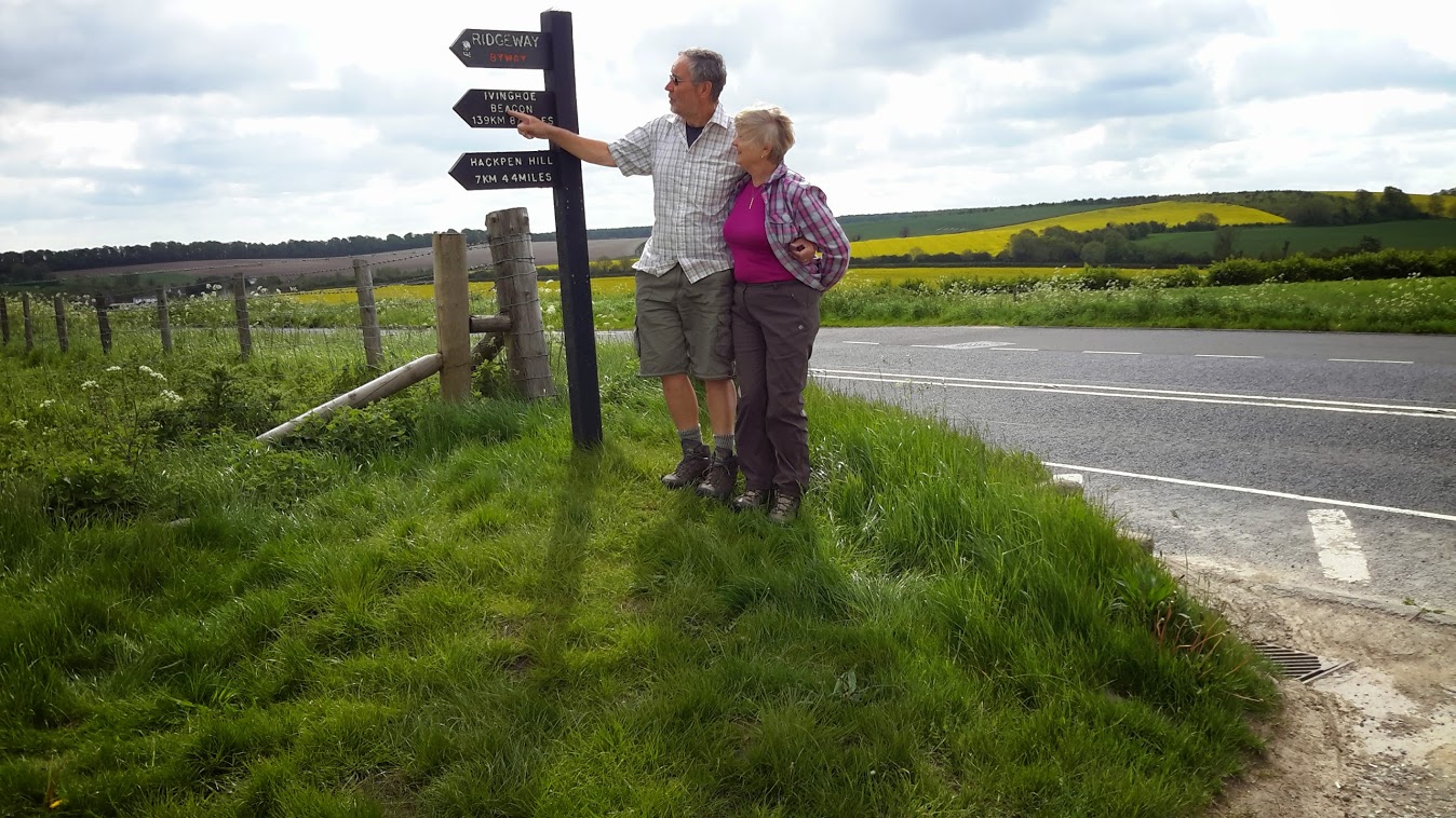 We were collected on time by the taxi for the 10 miles or so drive to Overton Hill where the chatty driver said it was well-worth a look at 'The Sanctuary' opposite the start, before setting off. The sun was still shining when the taxi driver took our photos, "all part of the service he said"! However excited we were to get to move on from this rather underwhelming place, as advised we popped over the road to The Sanctuary for a look at the circles of stones and posts, or now just the stone markers where the main stones used to be and more markers where the wooden posts would also have been before they rotted away, probably a very long time ago! We diligently read the info board pointing out what the experts had speculated they were all put there for. We met a nice couple from Wokingham doing the same circular browse and discovered they too were walking the Ridgeway, but in short sections by taking 2 cars and shuffling them from start to finish. Today they were starting the same section as us having completed other sections closer to home. Quickly passing us by although our pace, over time, was pretty similar and so we kept them in view in the distance for some way, as the husband had a bright luminous day pack and seemed to always walk several yards ahead of his wife (forgot to mention: as we were going back to Parklands otel tonight we had our large rucksacks but with just a day provision and no clothes so our pace must have been brisker due to this ). The broad path was shared by polite trail bikers, MTB cycles, horses and later on we passed through a horse and carriage event with a variety of sometimes quite elderly drivers and youthful passengers, not racing, but following a marked course taking in the Ridgeway and other by-ways on the downs.