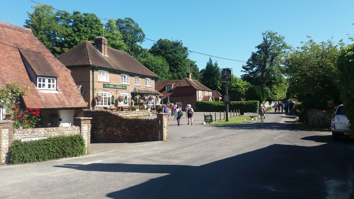 Nice traffic free coach ride back to the Shoe pub where they have kindly opened for coffee and bacon butties. The staff, In anticipation of our arrival, have made the butties and already put them on the counter. The coffee urn is piping hot to cope with the numbers of us turning up. So its out through the picture postcard village and back on the SDW divided walkers route up a beautiful gentle hill with views back over the Meon Valley below.
