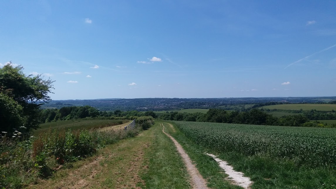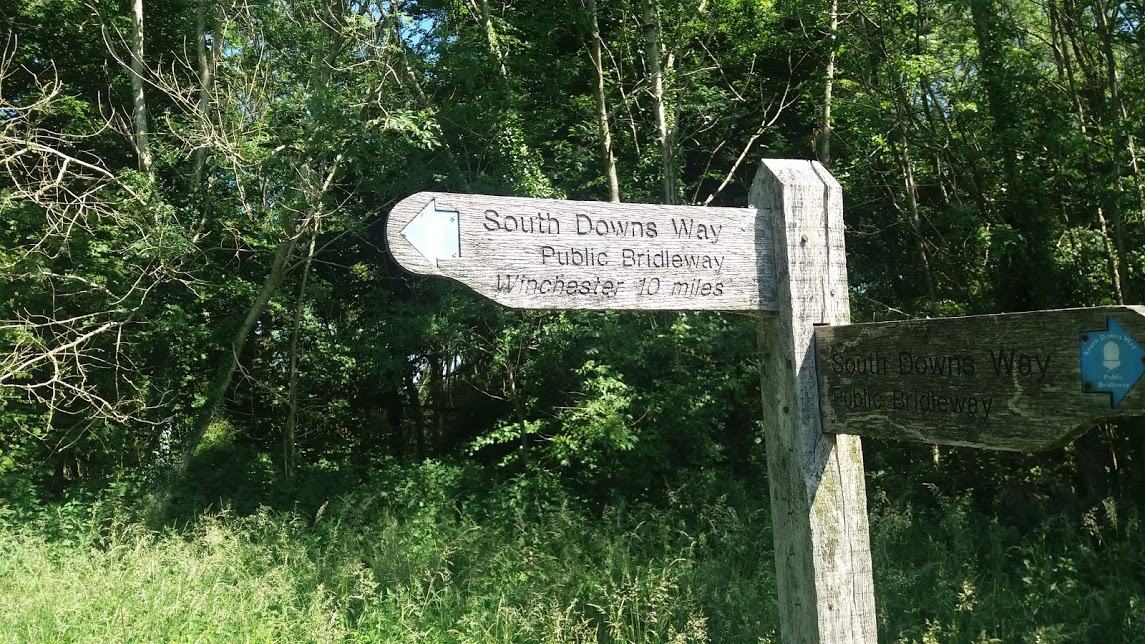 The first view of.......Winchester, looking tantalisingly close with just the M3 to cross and we were there.......... It turned out that this was not as easy as it looked and after photos, a little group now had bunched ready to take the final descent. Walkers were now huddled under the shade of a hedge, re-hydrating and gathering strength before the last 4 miles......yes 4 more miles. The heat was definitely draining and after passing through the pretty 'commuter' village of Chilcombe the SDW split for cyclists and walkers.