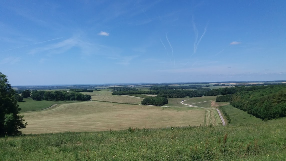 Anyway, back to the walk, the farm track turned back to a path as we headed through the rolling landscape of Gander Down along the Allan King Way, which I assumed was named after Allan and 'Googling' later it was indeed named after a founder member of the local Ramblers, naming the path from Dorchester to Winchester. It was a question of searching for shade now and a spinney on the left came up that was a perfect lunch and loo stop. We joined a couple who had already made it their stop and soon about ten others scattered themselves around in this rarely found shade. There were still about six miles to go and the reception was due to start at 4.30pm so needs must and we carried on down to Keepers Cottage, turning left and along Temple valley where a 'bike-point' was installed in the trees. This consisted of fresh water and somewhere to clean, pump up tyres and give the bike a general overhaul, including yourself, I assume. Should put these in for walkers! We peaked at Cheesefoot Head before crossing the main A272 for the second time today.