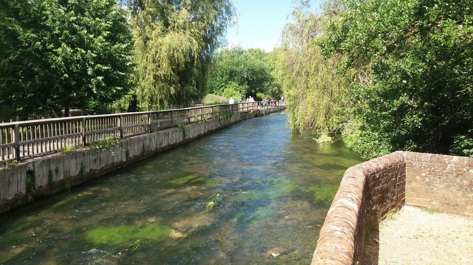 The last path crossing open fields before the M3 seemed to take for ever and there was no shade at all. Where all the crowds had gone we don't know as we hardly saw anyone from this stage on, till the end. We did bump into and chat with a young group, just starting on an adventure, walking in the other direction, with full packs, on their way to......... Basingstoke! Why go to Basingstoke I thought, but kept it to myself as the only bit of Basingstoke I know are the roundabouts and bypass! Pausing to view the speeding traffic over the M3 footbridge before we entered the outer Winchester area estates, just ambling and following our noses, noting the occasional acorn when they just seemed to disappear completely at a busy junction. We sort of knew we had to go down to the river but as we didn't fancy going wrong and doing more steps in this heat, I stooped low enough (for a bloke) to ask the way and was guided to a cut through and down to the lovely summer scene besides the River Itchen.